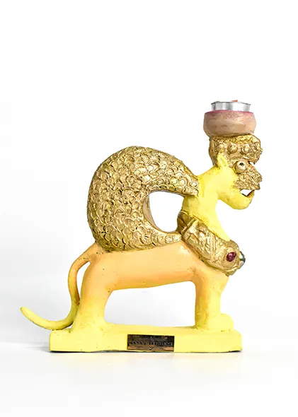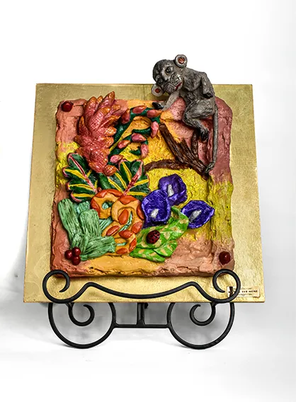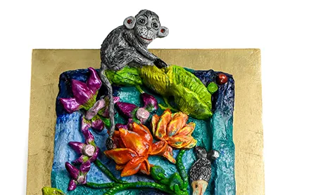 A captivating sculpture that intricately weaves elements of nature, plants, and a playful monkey, creating a harmonious and dynamic artistic representation.