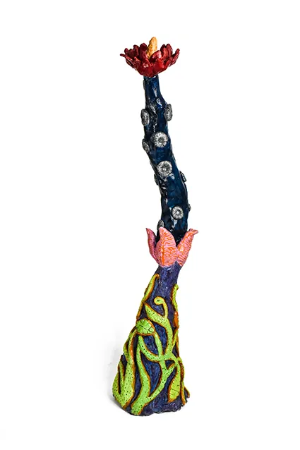 The sculpture, featuring a vibrant red flower as its centrepiece, conveys a rich tapestry of meanings and symbolism that resonate deeply with viewers.