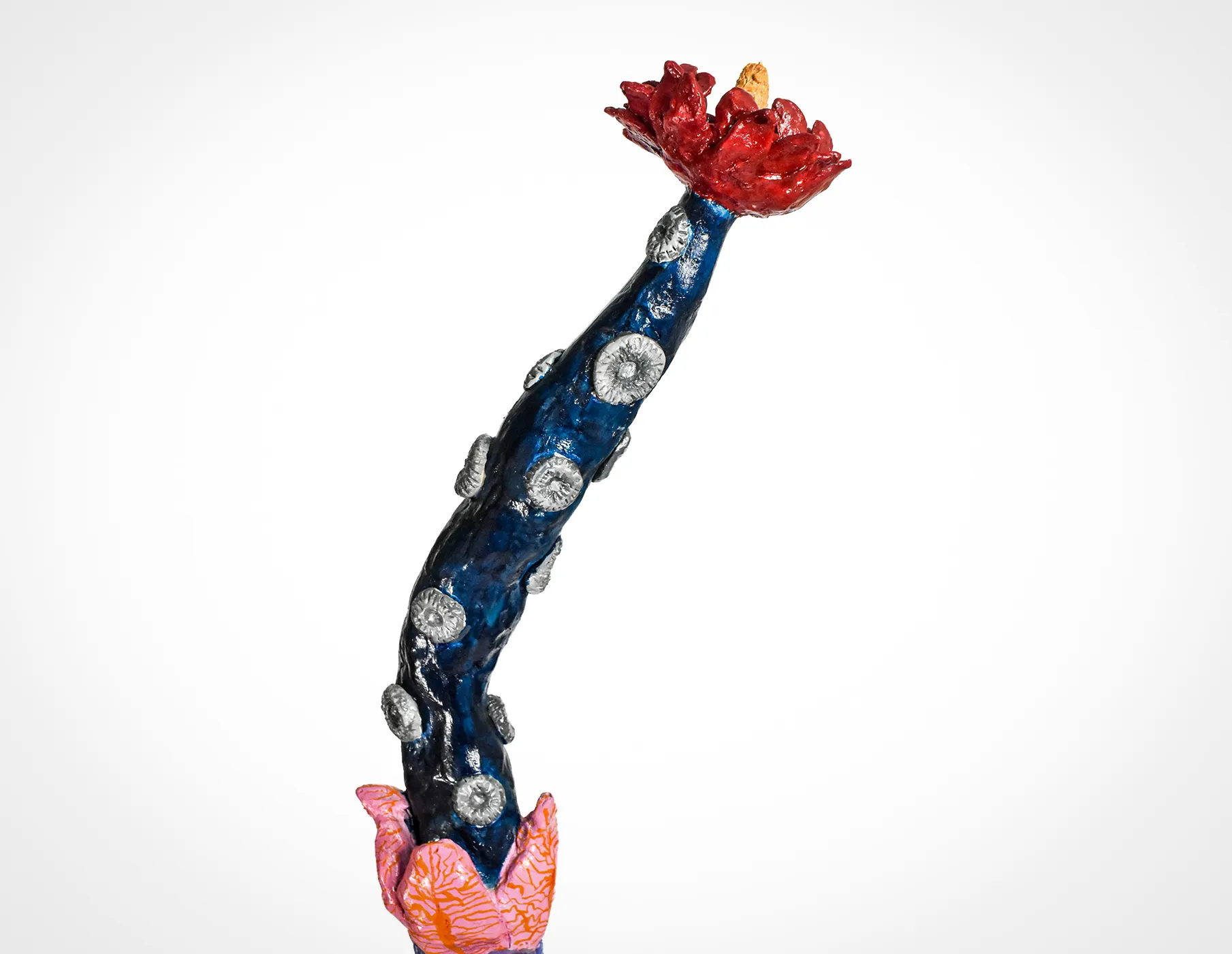 This striking sculpture encapsulates the essence of the lifespan of a coral through its vivid and contrasting colors. The sculpture's base, rooted in deep purples and adorned with vibrant green and yellow tendrils, suggests the very beginning of life, where potential and growth intertwine in the fertile ocean reefs.