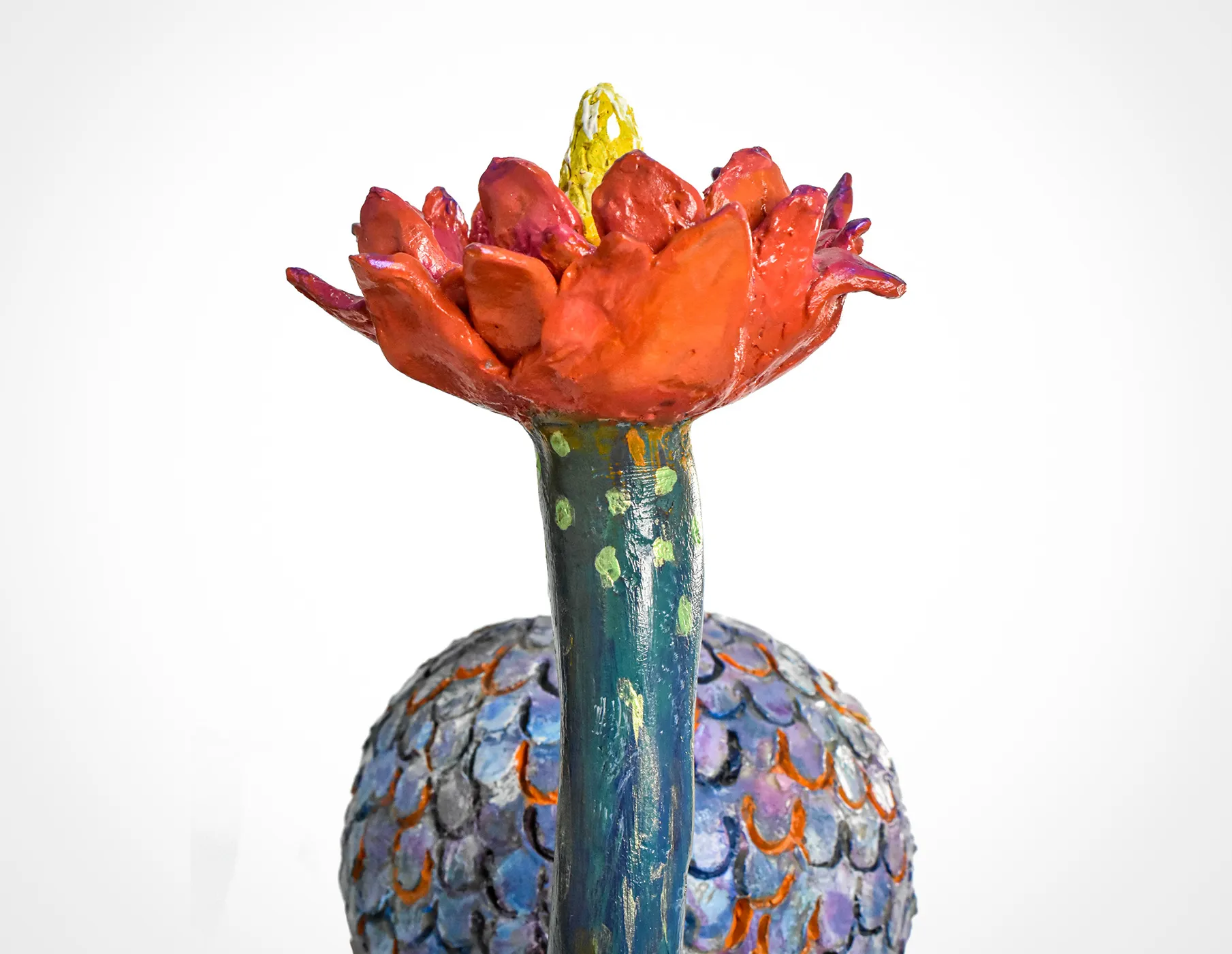 A colorful artifact is displayed on a wooden stand, with its unique design, showcasing a mix of white, blue and purple hues. The flower on top adds a pop of color and liveliness to the scene. The vase is the focal point of the image, with its sculptural shape catching the eye. The overall composition exudes elegance and artistry, making it a strong representation of the fantastic world carved out of the artist's imagination.