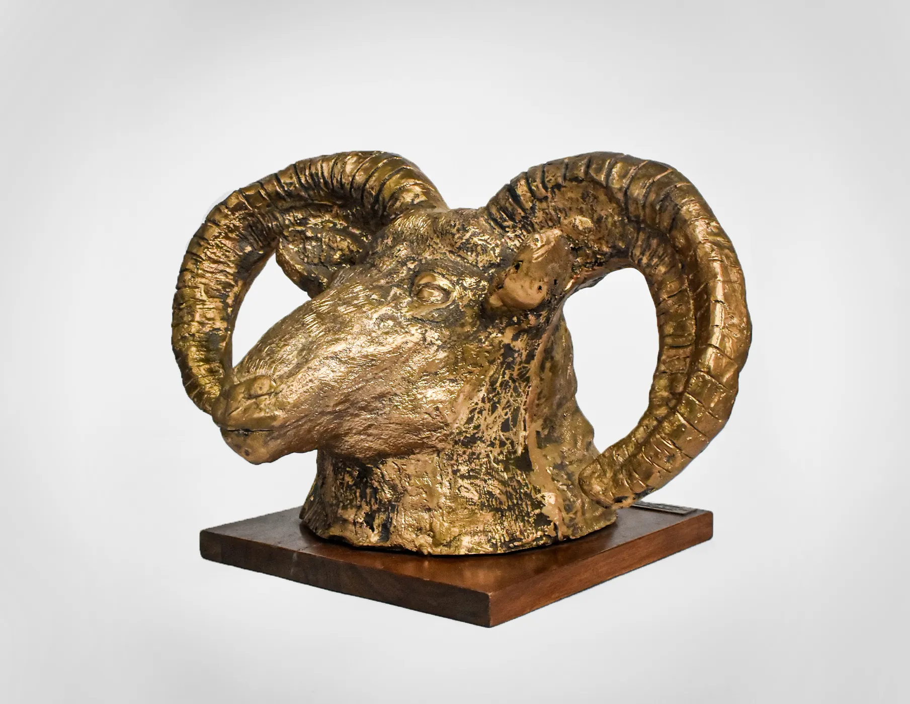 A stunning copper sculpture of a ram’s head mounted on a sturdy wooden base is showcased against a clean white background. The intricately detailed features are highlighted by the copper hue of the sculpture, exuding a sense of elegance and craftsmanship. The statue exudes a sense of strength and power, capturing the essence of the majestic animal. The contrast between the copper and wooden elements adds a touch of sophistication to the overall composition, artistry, and beauty of this exquisite ram’s sculpture.