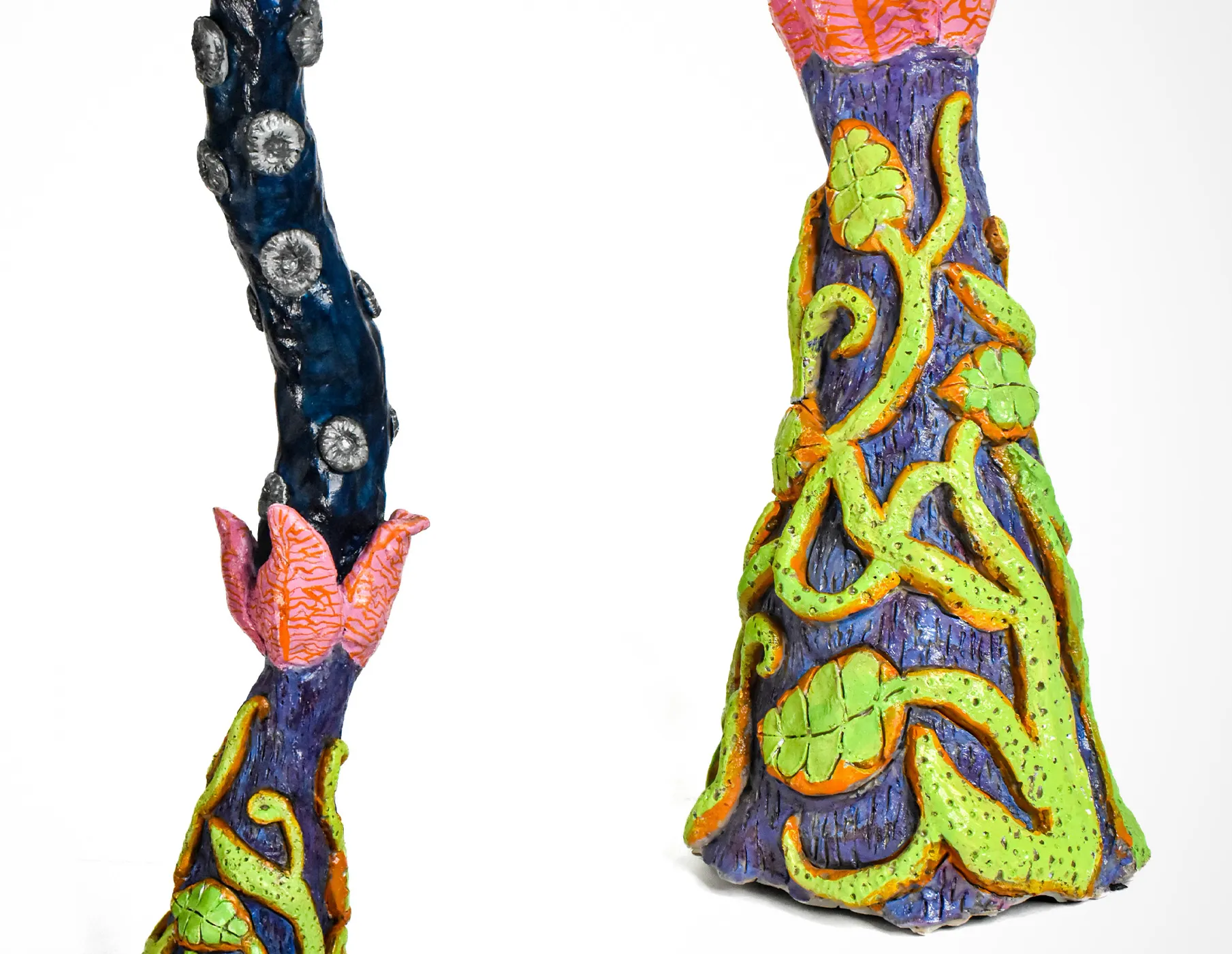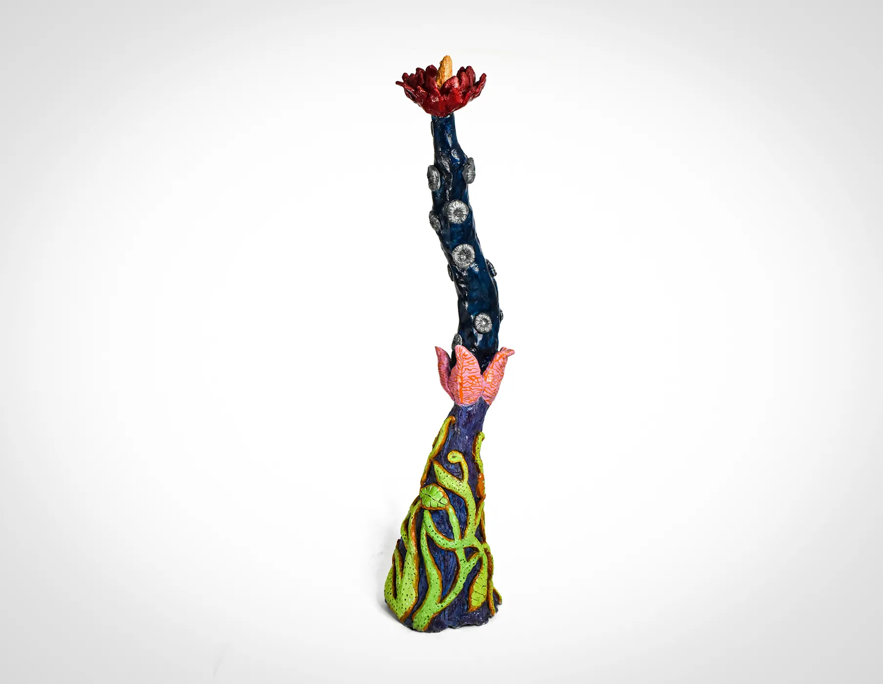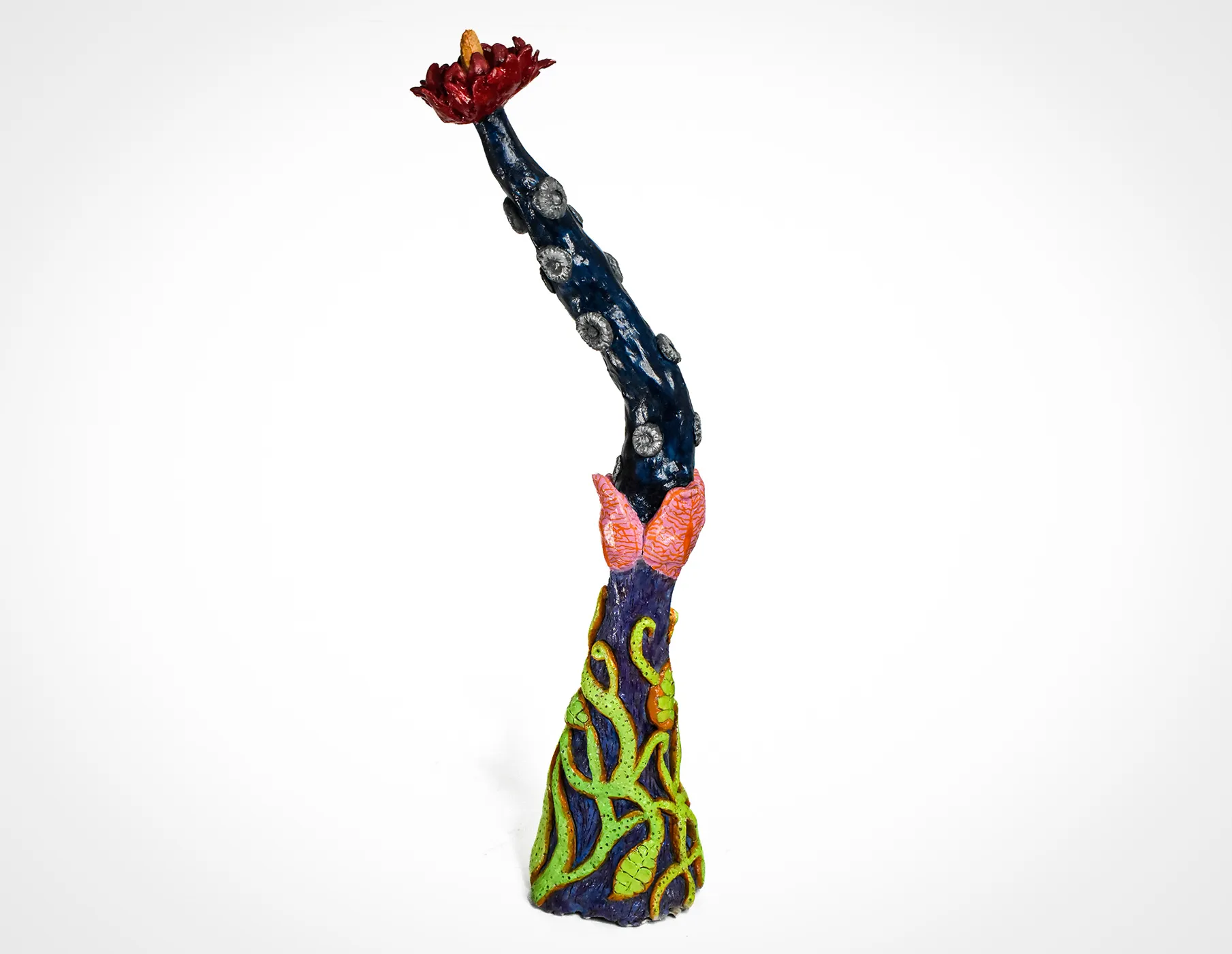 This striking sculpture encapsulates the essence of the lifespan of a coral through its vivid and contrasting colors. The sculpture's base, rooted in deep purples and adorned with vibrant green and yellow tendrils, suggests the very beginning of life, where potential and growth intertwine in the fertile ocean reefs.