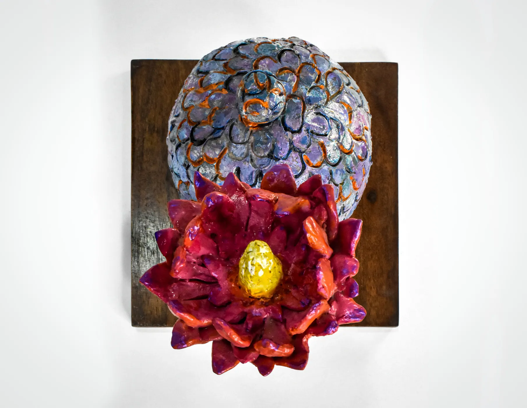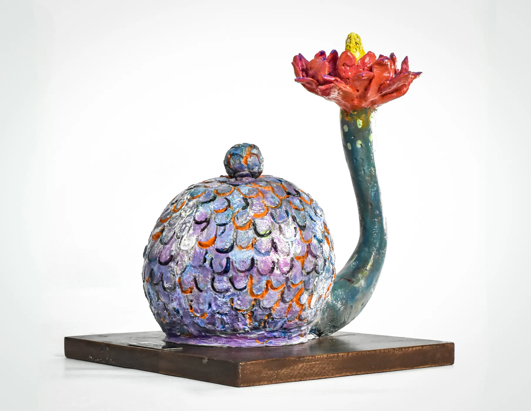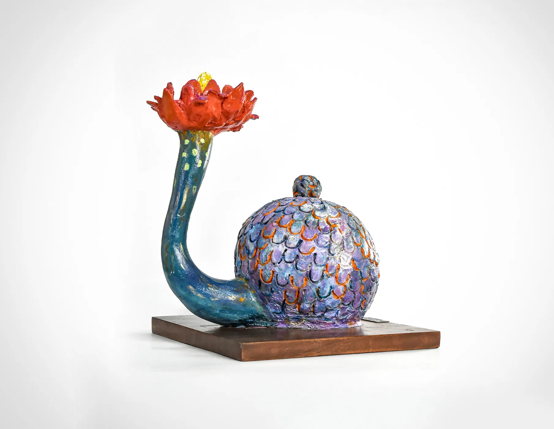 A colorful artifact is displayed on a wooden stand, with its unique design, showcasing a mix of white, blue and purple hues. The flower on top adds a pop of color and liveliness to the scene. The vase is the focal point of the image, with its sculptural shape catching the eye. The overall composition exudes elegance and artistry, making it a strong representation of the fantastic world carved out of the artist's imagination.