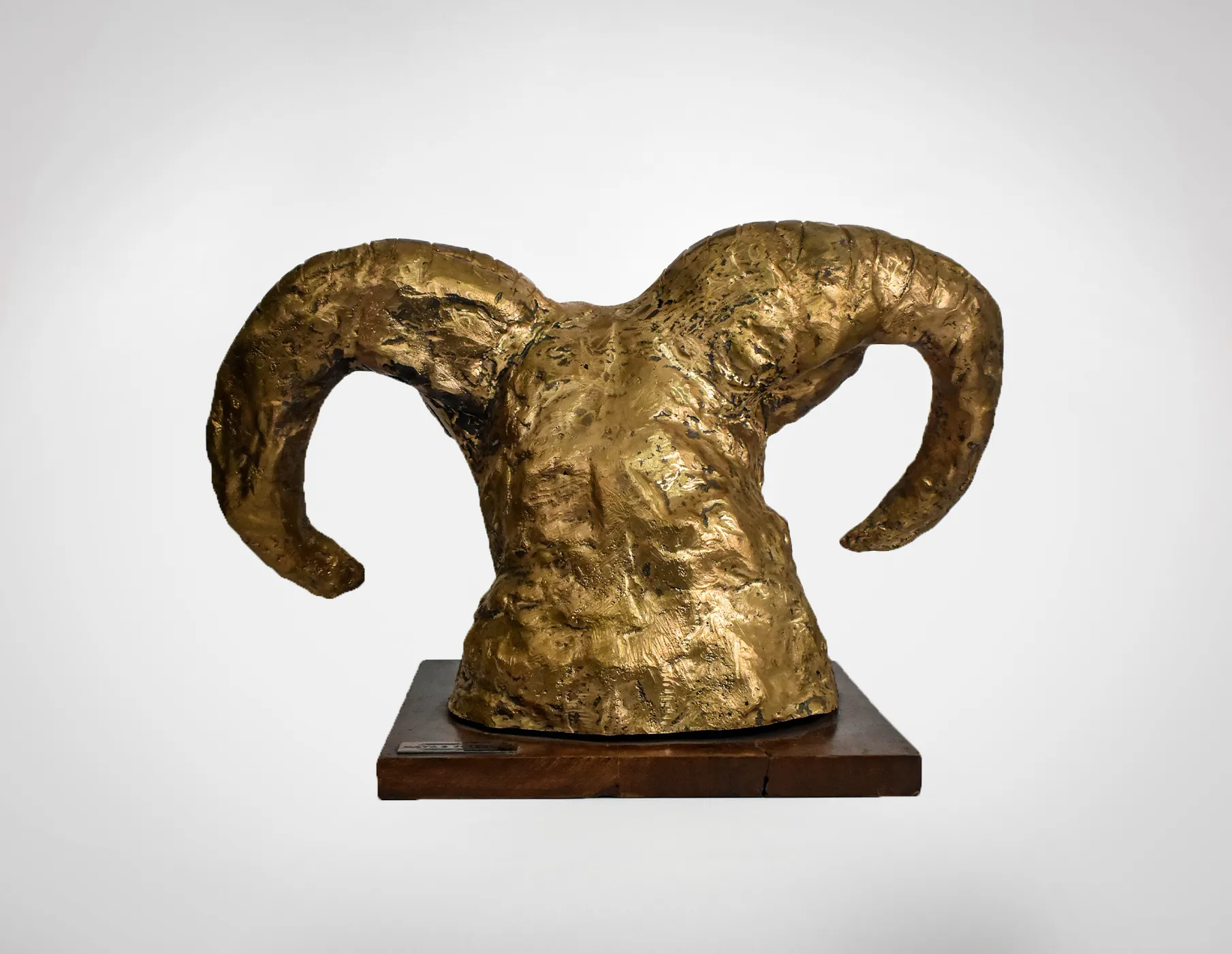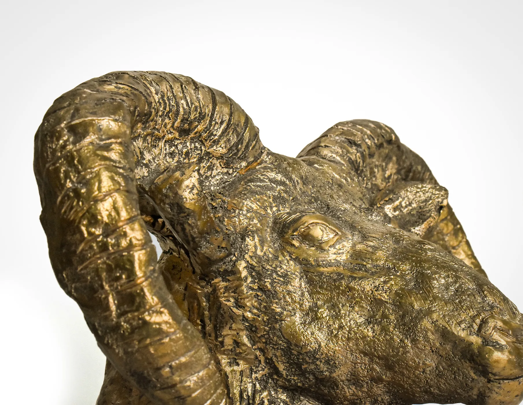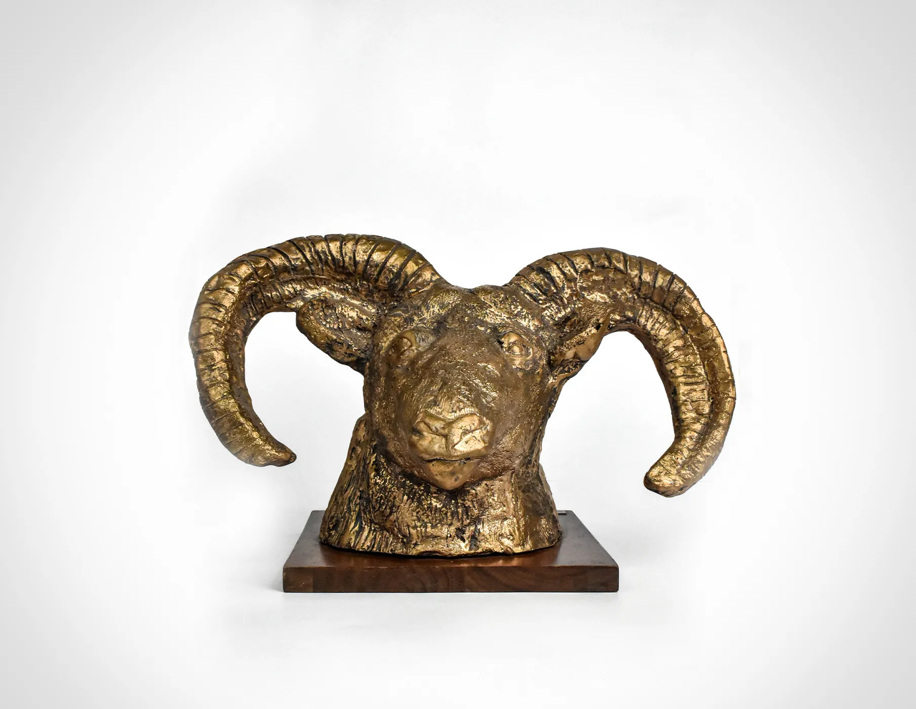 A stunning copper sculpture of a ram’s head mounted on a sturdy wooden base is showcased against a clean white background. The intricately detailed features are highlighted by the copper hue of the sculpture, exuding a sense of elegance and craftsmanship. The statue exudes a sense of strength and power, capturing the essence of the majestic animal. The contrast between the copper and wooden elements adds a touch of sophistication to the overall composition, artistry, and beauty of this exquisite ram’s sculpture.