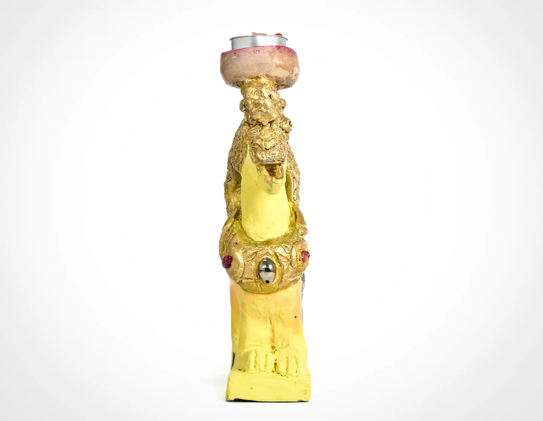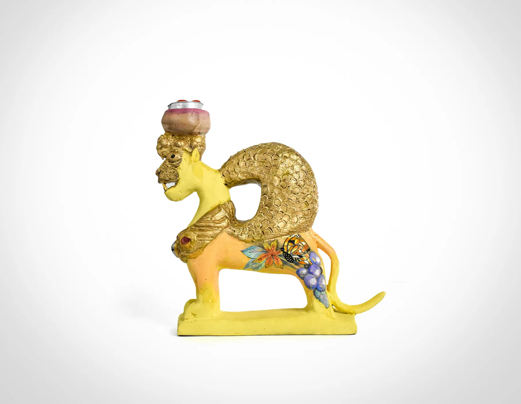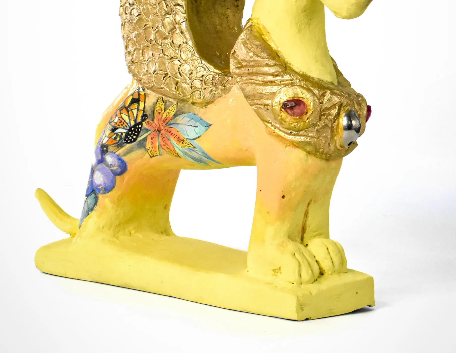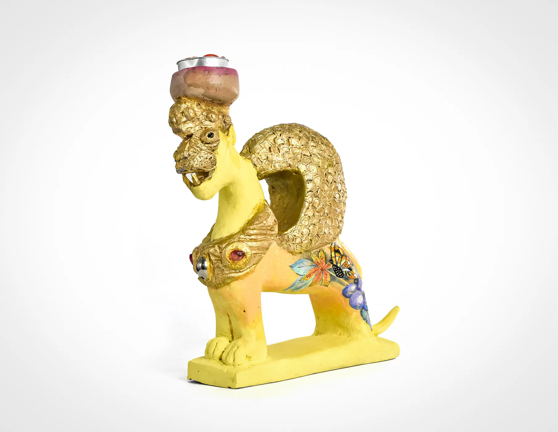 This is an artistic sculpture that doubles as a candle stand. It features a stylized creature with a blend of zoomorphic elements. The sculpture is predominantly yellow with gold accents, suggesting a sense of preciousness and value often associated with spiritual artifacts. The creature's golden crown is adorned with intricate textures and patterns resembling royalty. The creature's back curls into elegant, scaled wings, reminiscent of mythical beasts' ability to fly.